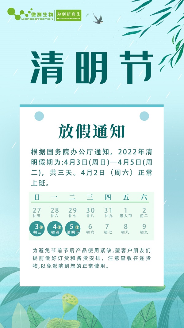 響應(yīng)國家政策清明節(jié)放假3天,清明好時節(jié),行走山水間,大家有出行計劃的也要記得做好疫情防護(hù)哦,南京微測放假期間安排如下: